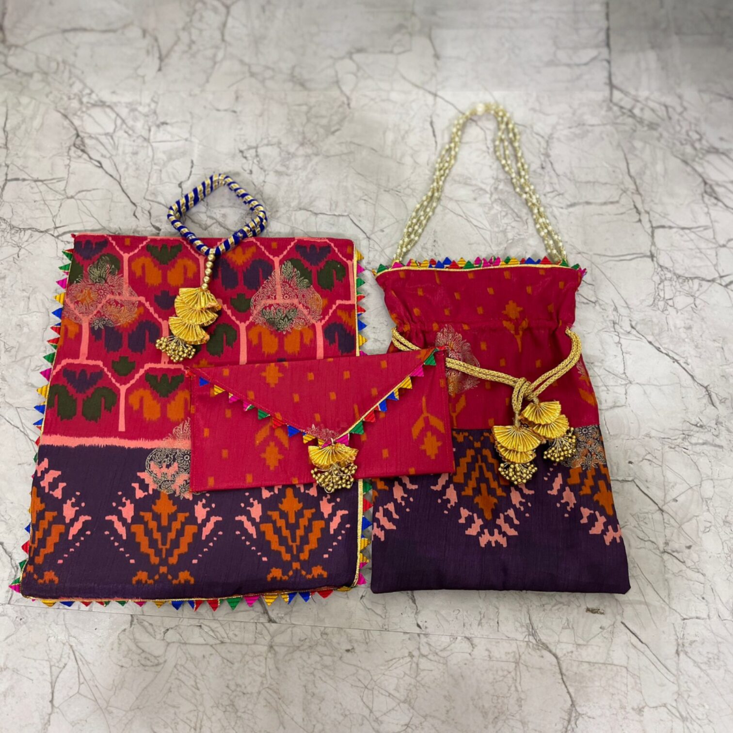 Left: a square tote-style bag with a structured shape and a short handle. The handle is wrapped in blue and gold thread, and there are gold tassels (latkans) hanging from it. The bag features rich ikat-inspired patterns in deep pink, maroon, purple, orange, and olive, with multicolored triangular edging (gota-style trim) along the sides. There’s also a front flap pocket with decorative tassels.