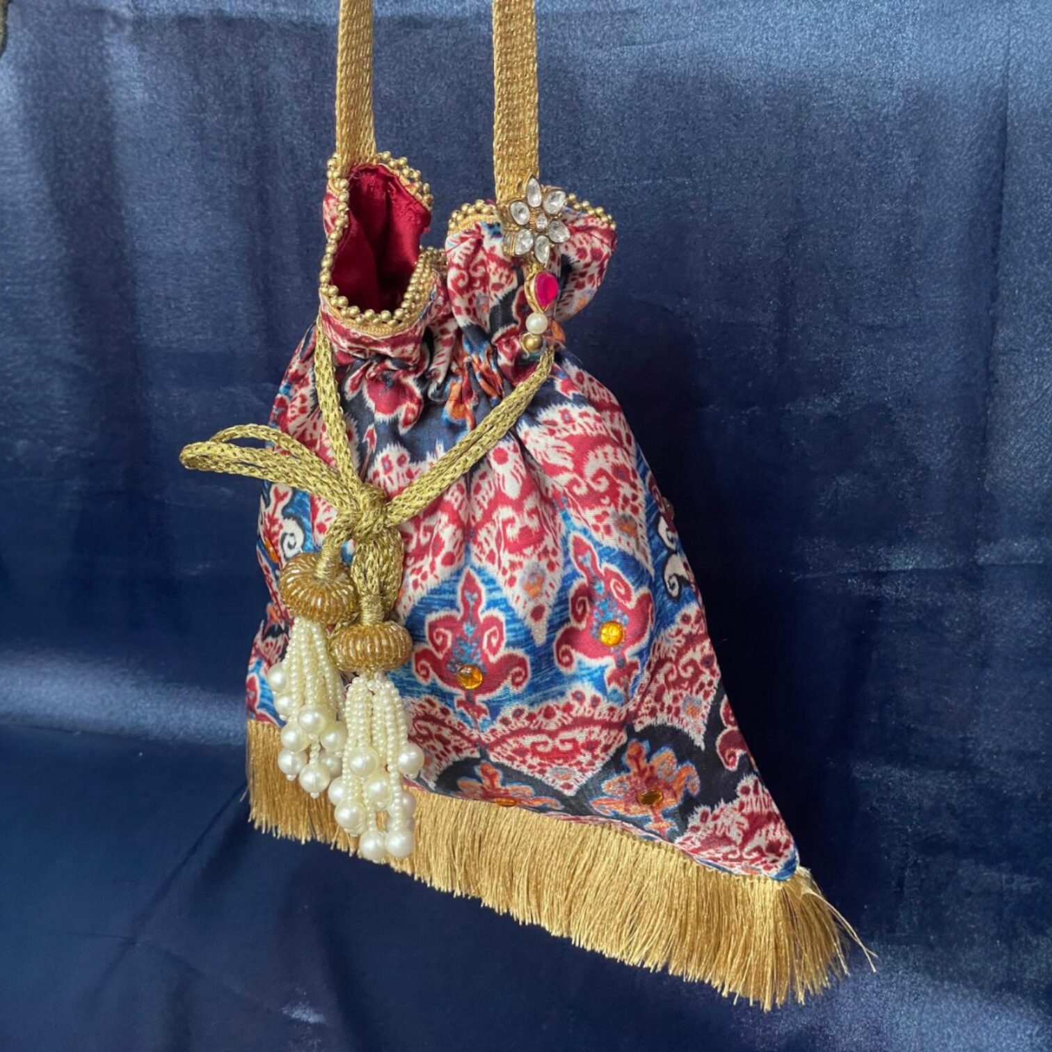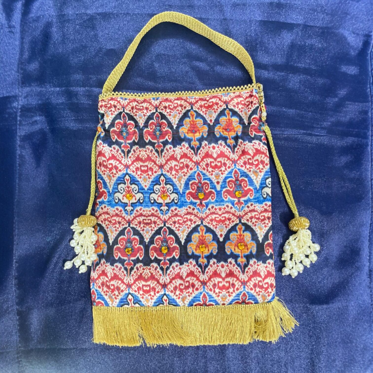 This elegant Ikkat Potli Bag blends traditional charm with modern style. Crafted from vibrant ikkat-print fabric, it features intricate patterns in rich hues, highlighted with golden tassel fringes at the bottom. The potli is adorned with pearl latkan hangings and a sturdy golden handle, making it both beautiful and functional. Ideal for festive occasions, weddings, gifting, or styling with ethnic outfits, this potli adds a touch of grace to every celebration.