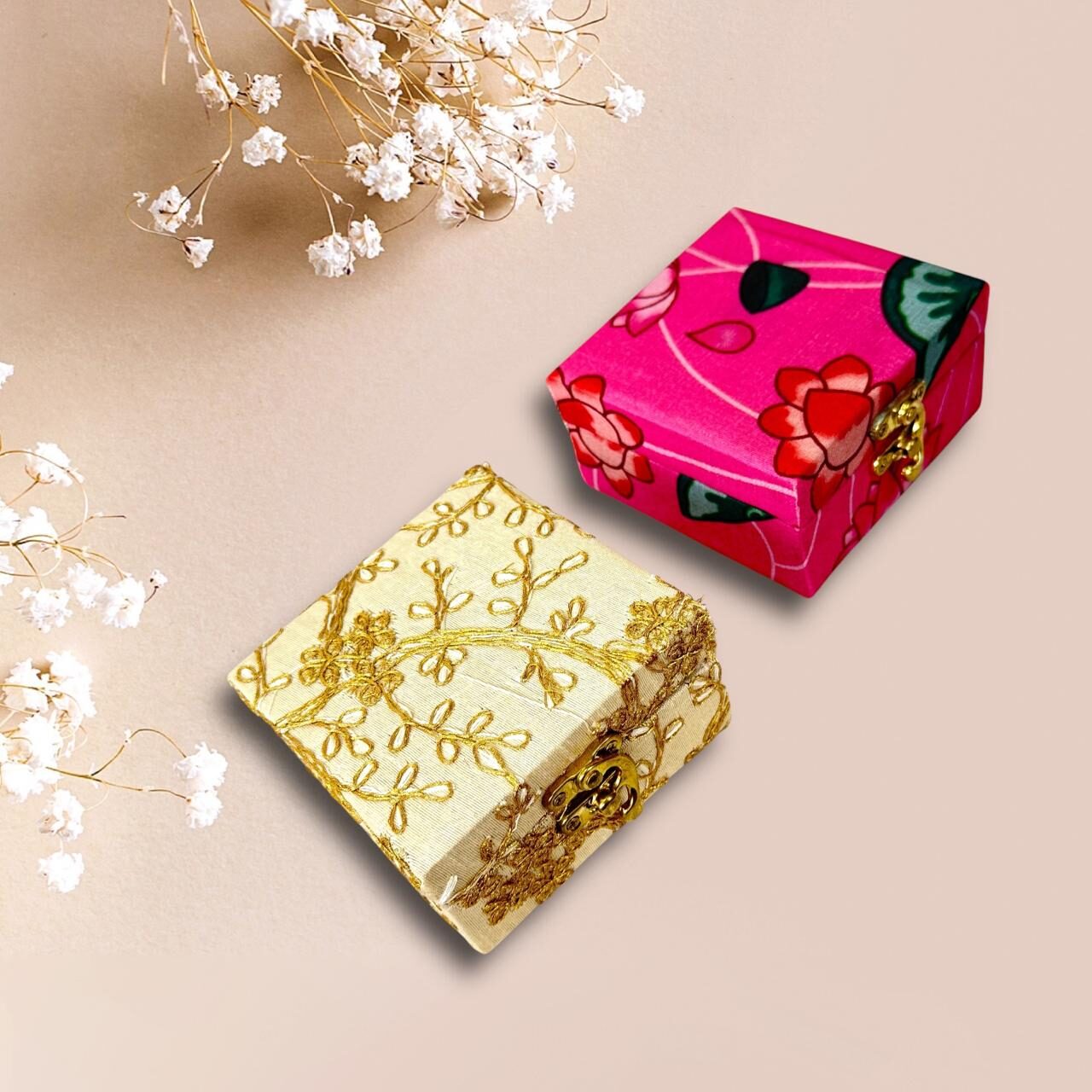 A pair of elegant small cash boxes designed for gifting and storage. One box features a bright pink fabric with bold floral prints and a gold-toned clasp, giving it a festive and vibrant look. The other box has a sophisticated cream base adorned with intricate golden embroidery, creating a rich and traditional aesthetic. Both boxes are compact, sturdy, and ideal for gifting cash, jewelry, or small keepsakes.