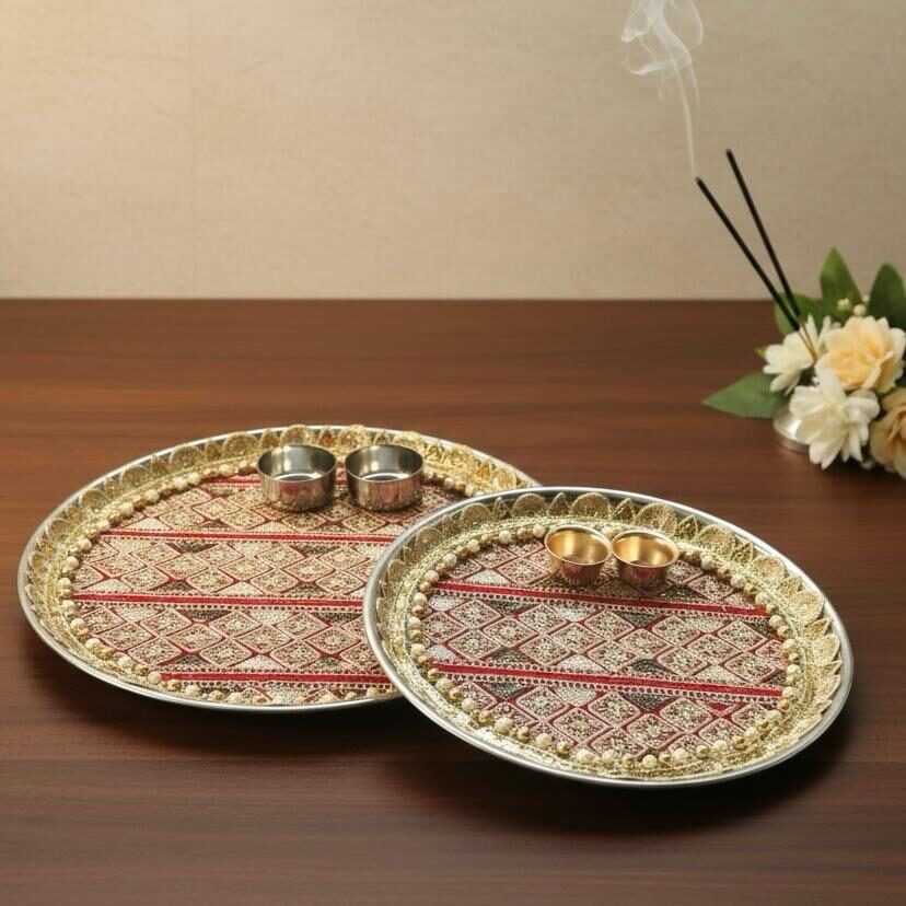 Elevate your rituals with our exquisitely handcrafted Pooja/Aarti Thalis, thoughtfully designed to blend tradition with elegance. Each thali is lovingly made by skilled artisans, featuring intricate detailing, vibrant colors, and premium embellishments that make every prayer moment feel special. Perfect for daily pooja, festive celebrations, weddings, and gifting, these versatile thalis complement all décor styles—from classic to contemporary. Whether adorned with kundan, beads, fabric work, or minimal accents, every piece reflects devotion, craftsmanship, and timeless beauty.