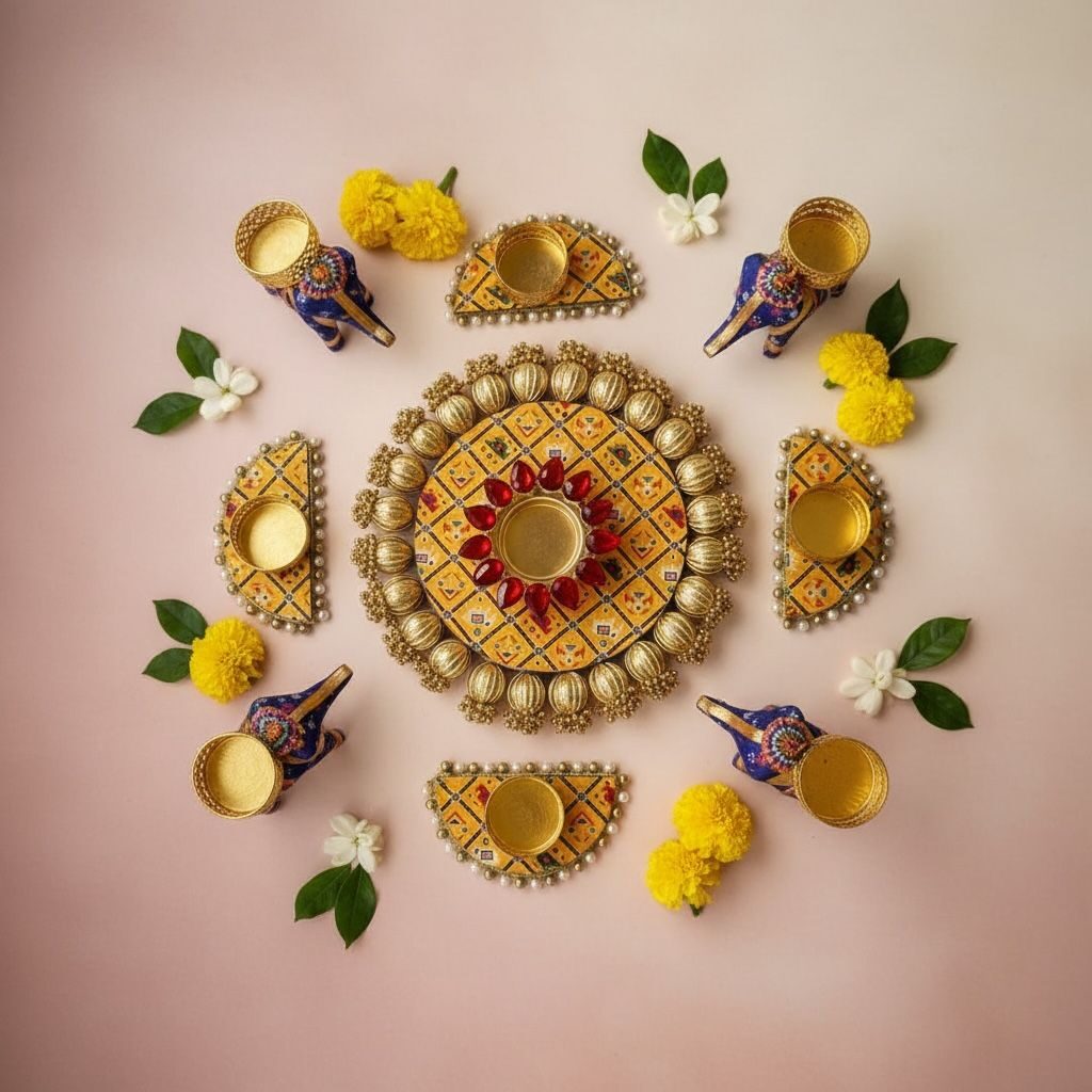 Elevate your festive décor with our luxuriously handcrafted rangoli sets and decorative platters, thoughtfully designed to suit every style — from timeless traditional patterns to modern artistic expressions. Each piece is a celebration of intricate craftsmanship, vibrant detailing, and cultural elegance, perfect for adorning entrances, pooja setups, or serving as statement festive accents. Versatile and premium in finish, these creations bring warmth, auspicious energy, and a refined festive charm to every occasion, making them ideal for both personal use and elegant gifting.