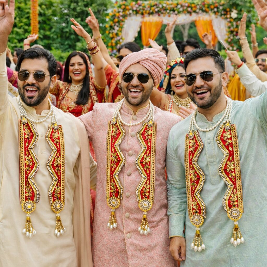 Elevate your wedding or festive entrance with this luxurious red swagat mala, beautifully crafted with intricate gota patti work and ornate golden embroidery. The rich velvet base adds a royal touch, while the shimmering zari detailing and floral motifs enhance its traditional charm. A double pearl loop makes it easy to hold or hang, and the elegant bead-and-tassel drops at the bottom complete the grand look. Perfect for welcoming guests, bridal entry rituals, and ceremonial décor, this swagat mala brings unmatched grace and celebration-ready elegance.