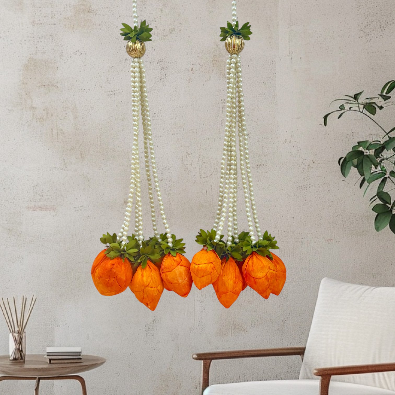 Add divine elegance to your home with this beautiful Lotus Bud & Pearl Hanging — a perfect blend of tradition and sophistication. Handcrafted with lifelike orange lotus buds and adorned with delicate pearl strings, this décor piece symbolizes purity, prosperity, and positive energy.