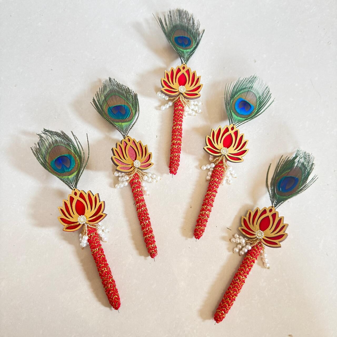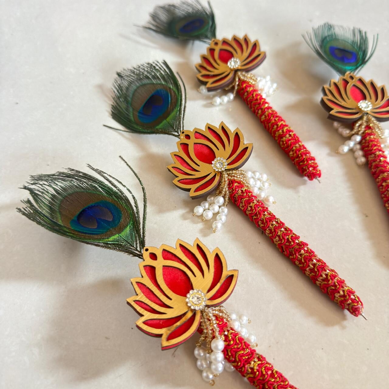 Add a touch of tradition and elegance to your wedding invitations with this handcrafted Kankotri Lakhan Pen. Beautifully adorned with a lotus-inspired motif, vibrant red and gold detailing, pearl embellishments, and an auspicious peacock feather (morpankh), this pen is designed especially for writing names and details on kankotris and shubh vivah cards. Its rich festive look makes it a perfect accessory for wedding ceremonies, invitation rituals, and auspicious occasions, while also serving as a charming keepsake or gift.