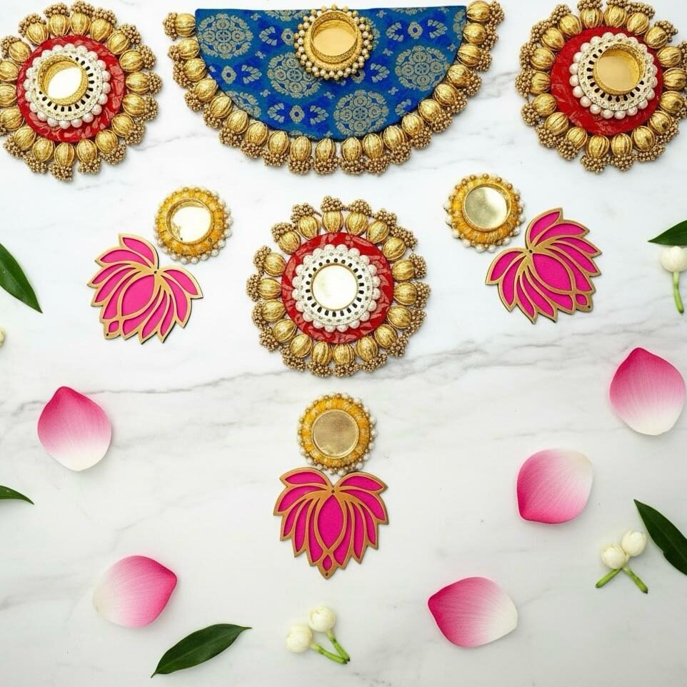 Elevate your festive décor with our luxuriously handcrafted rangoli sets and decorative platters, thoughtfully designed to suit every style — from timeless traditional patterns to modern artistic expressions. Each piece is a celebration of intricate craftsmanship, vibrant detailing, and cultural elegance, perfect for adorning entrances, pooja setups, or serving as statement festive accents. Versatile and premium in finish, these creations bring warmth, auspicious energy, and a refined festive charm to every occasion, making them ideal for both personal use and elegant gifting.