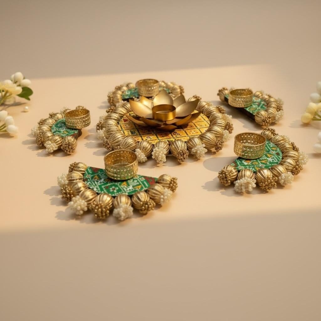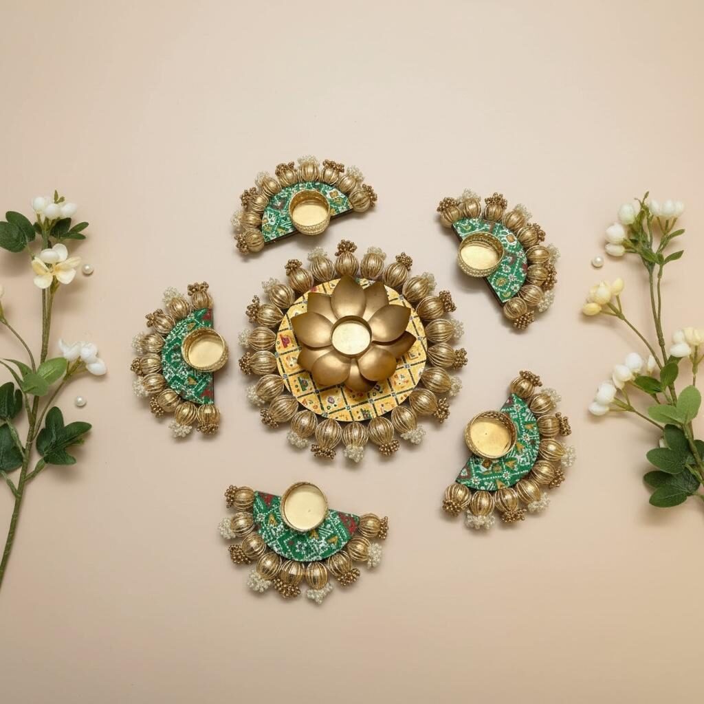 Elevate your festive décor with our luxuriously handcrafted rangoli sets and decorative platters, thoughtfully designed to suit every style — from timeless traditional patterns to modern artistic expressions. Each piece is a celebration of intricate craftsmanship, vibrant detailing, and cultural elegance, perfect for adorning entrances, pooja setups, or serving as statement festive accents. Versatile and premium in finish, these creations bring warmth, auspicious energy, and a refined festive charm to every occasion, making them ideal for both personal use and elegant gifting.