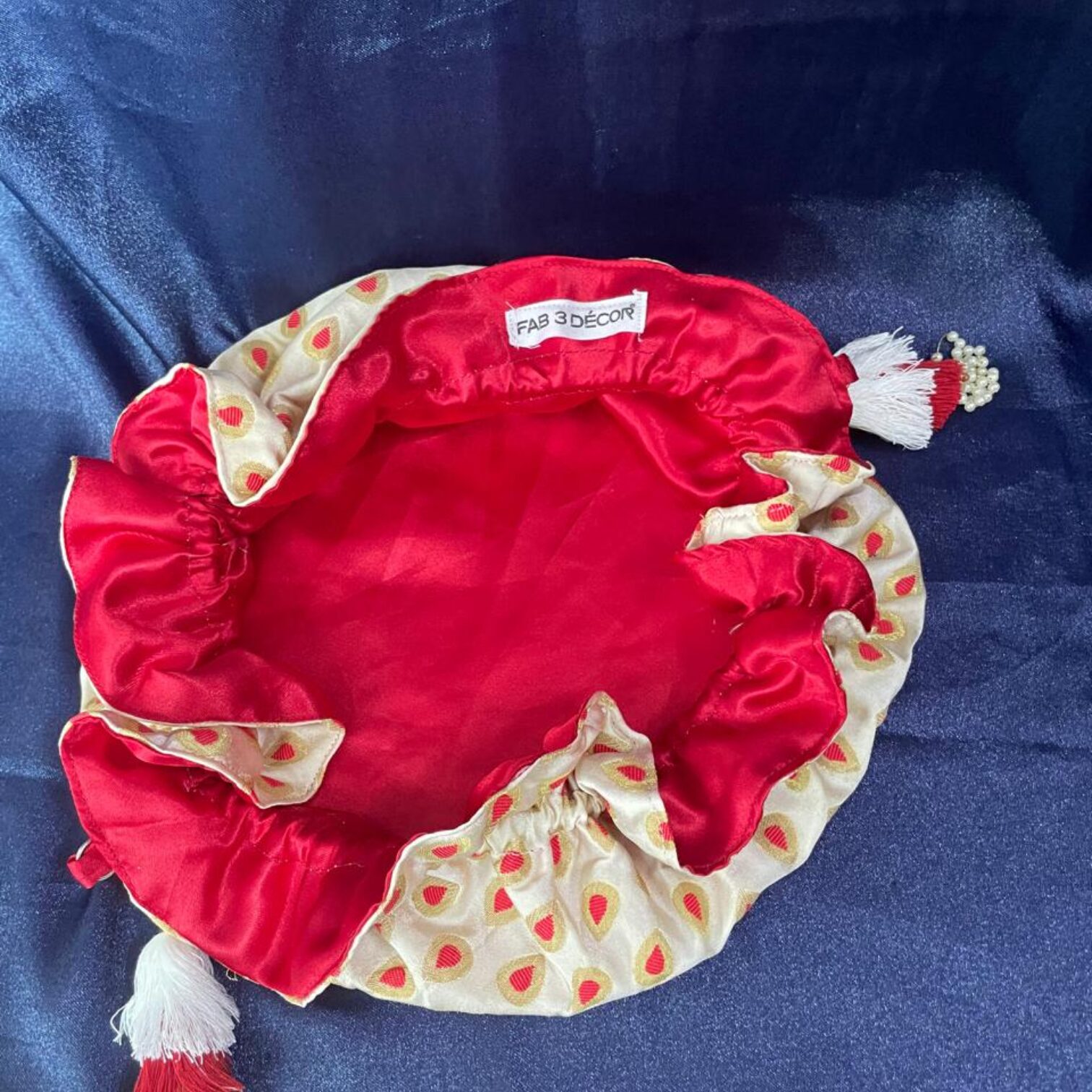 This elegant round potli is crafted in rich red satin and adorned with a beautiful gold-motif fabric border, giving it a perfect blend of traditional charm and festive elegance. The spacious circular design makes it ideal for gifting, wedding favors, haldi–mehendi essentials, or carrying small accessories. Finished with premium drawstrings and delicate tassels, this potli adds a luxurious touch to any occasion. Lightweight, stylish, and versatile, it complements both ethnic and festive looks effortlessly.
