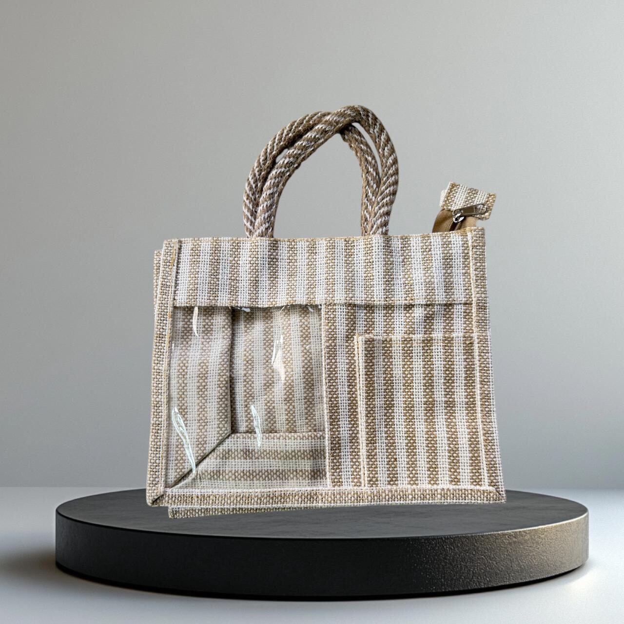 A stylish striped jute bag in beige and white tones, featuring a sturdy braided handle and a transparent front panel. The clear PVC window allows easy visibility of the contents inside, making it perfect for gifting, hampers, or display packaging. Its durable jute material and clean, minimal design give it an eco-friendly and modern look.