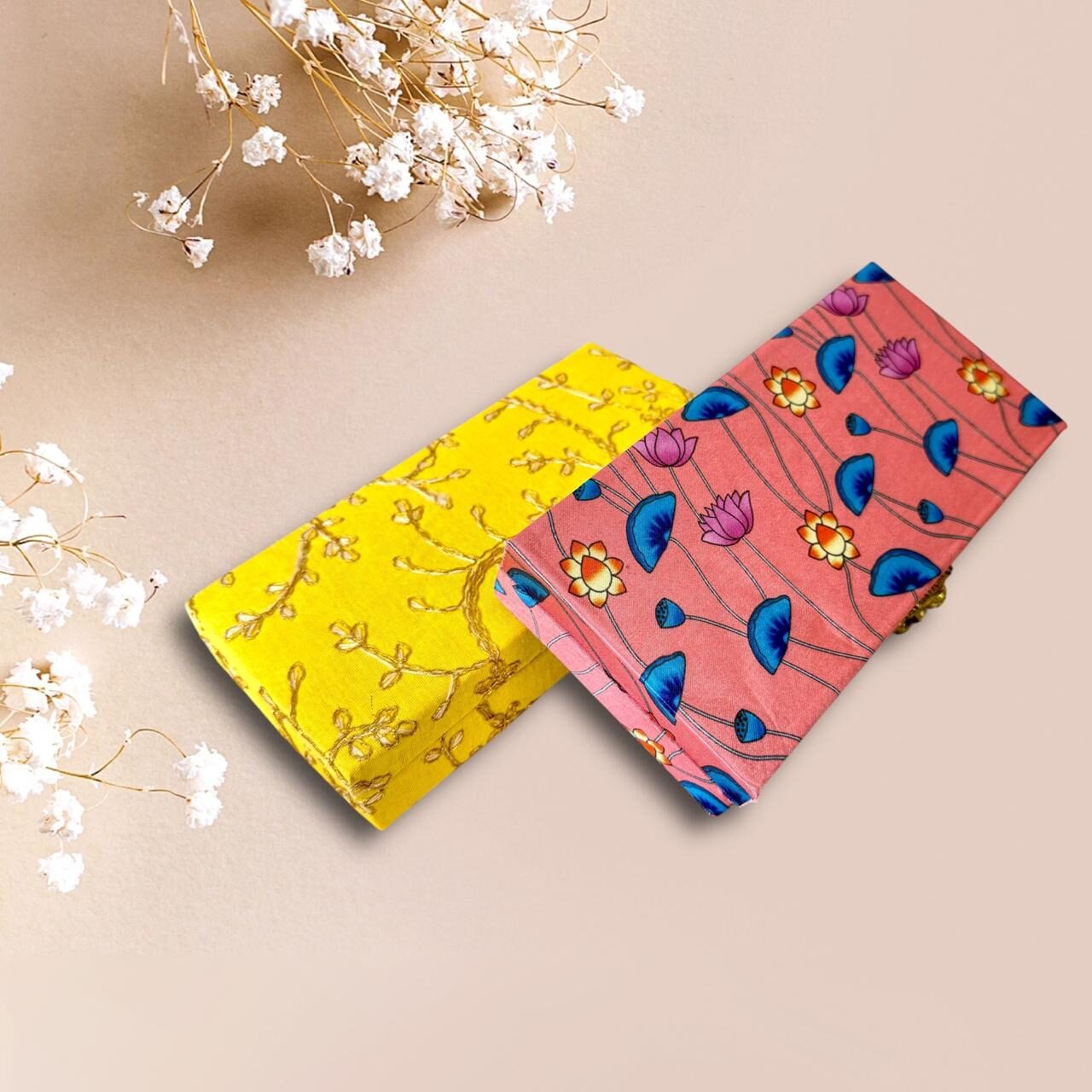 One box comes in a bright yellow shade with delicate embroidered branch motifs, giving it a subtle and traditional handcrafted charm.